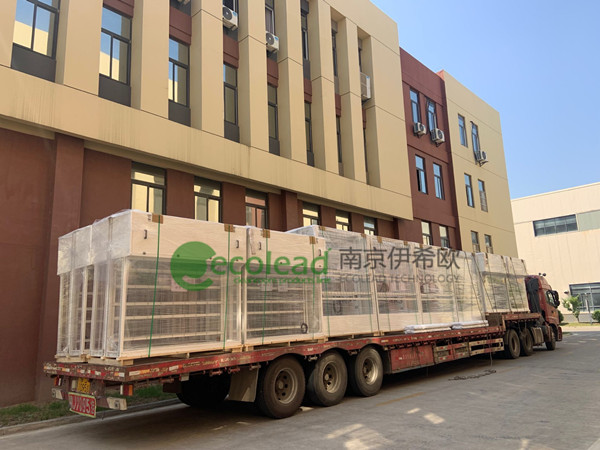湖北武汉某集成电路公司订购的自动卷帘式过滤器最后一批完成交货 设备名称:自动卷帘式过滤器 设备数量:8套(两台拼接上下拼接) 发货日期:2022年6月17日 项目简介: 湖北武汉某集成电路公司订购的自动卷帘式过滤器,最后一批发货数量8套,至此本次合同总数量30套均发货完毕,收到客户的发货计划后,我司安排17.5m的平板车整车发货,满足客户的到货日期和疫情期间客户的收货要求。 产品简介: 自动卷帘式过滤器尺寸:4480W*4452H*650D 风量:120000 m³/h,主体框架材质:2.0mmt冷板烤漆,立式电机: 380V 200W减速一体电机,滤料:卷绕式过滤器专用G3滤棉,配套固定安装辅件、顶部封板等材料。 工作原理 主要是由滤料、滤料缠绕系统及自动控制部分组成。 新过滤材料装在上料箱,当进风带有高浓度含尘空气通过卷绕式过滤器后,过滤器前后压差随滤尘增加而逐步上升。当过滤器阻力上升到设定的终阻力值时,压差开关开始动作,卷绕系统更新滤料,当差压降低后停止传动,更新滤料工作完毕,重新进行过滤。